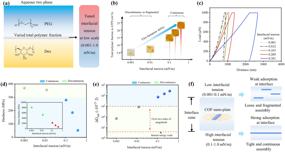 本文发现双水相体系的界面张力对于COF结构单元的组装具有显著影响。当界面张力较低时(0.001-0.1 mN/m),界面处难以形成稳定连续的薄膜;当界面张力增加至0.1-1.0 mN/m,在水-水界面处可得到连续的COF膜(图4a-4b)。为考察界面张力对于COF膜结构转化过程的影响,采用纳米压痕技术探测不同界面张力下双水相法成膜的强度(图4c-4d)。结果表明,较低的界面张力(0.001-0.1 mN/m)不利于COF单元间的连接和组装,导致膜(或片层)具有较弱的机械性能。而较高的界面张力(0.1-1.0 mN/m),可强化COF单元在界面处的铺展和连接,赋予COF膜良好的机械性能。此外,不同界面张力下双水相体系的界面吸附能计算结果表明,低界面张力双水相体系难以为界面生成的纳米聚合物提供稳定的吸附-锚定位点,导致纳米聚合物无法在界面区域进行连续性组装。相比之下,高界面张力双水相体系的界面对应的吸附能超过热力学能垒2-4个数量级,此时界面处可为反应生成的聚合物单元提供稳定的锚定位点,为后续构筑单元间的组装堆叠提供稳定的环境,从而制备得到连续的 COF-DhTGc˪膜(图4e-4f)。图4. 界面张力对COF-DhTGc˪膜形成的影响。(a) ATPS界面张力调节示意图;(b-f) 不同界面张力下COF-DhTGc˪膜的成膜性、载荷-压深曲线、硬度和弹性模量、界面吸附能和铺展-组装过程示意图。