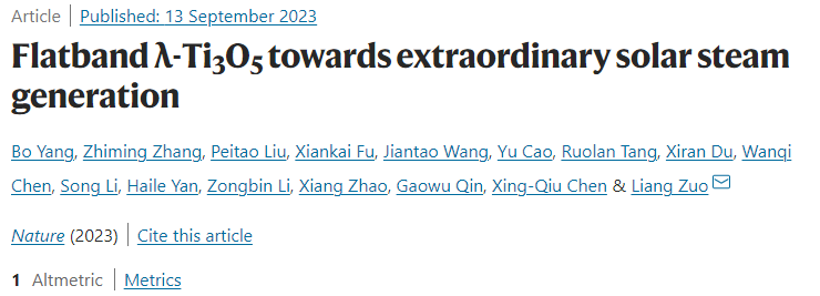本研究证明金属λ-Ti3O5在太阳能吸收方面具有最高的平均吸收率,达到96.4%。通过将λ-Ti3O5粉末集成到具有锥形空腔的多孔PVA水凝胶基三维倾斜结构蒸发器中,实现了6.09 kg/m^2/h的高蒸发速率,而无需盐沉淀。这种突出表现可以归因于三个因素。首先,Ti-Ti二聚体在费米能级附近诱导出平带,导致高的能带密度,从而提高太阳能吸收率。此外,λ-Ti3O5具有较低的热导率,促进了有效的太阳能转换和高热局域化效果。其次,暴露在λ-Ti3O5表面的Ti-Ti二聚体和U型grOOVe结构对水的吸附和解离起着重要作用。特别是,亚稳态H3O*单元的频繁出现以及质子的快速转移有利于界面水的蒸发,以小团簇的形式存在。第三,引入锥形空腔可以提供更深入的太阳光进入,更好地平衡太阳能蒸发和供水之间的关系。因此,有效表面积用于太阳能吸收和水蒸发显著增加,并且可以防止盐沉淀问题的发生。
