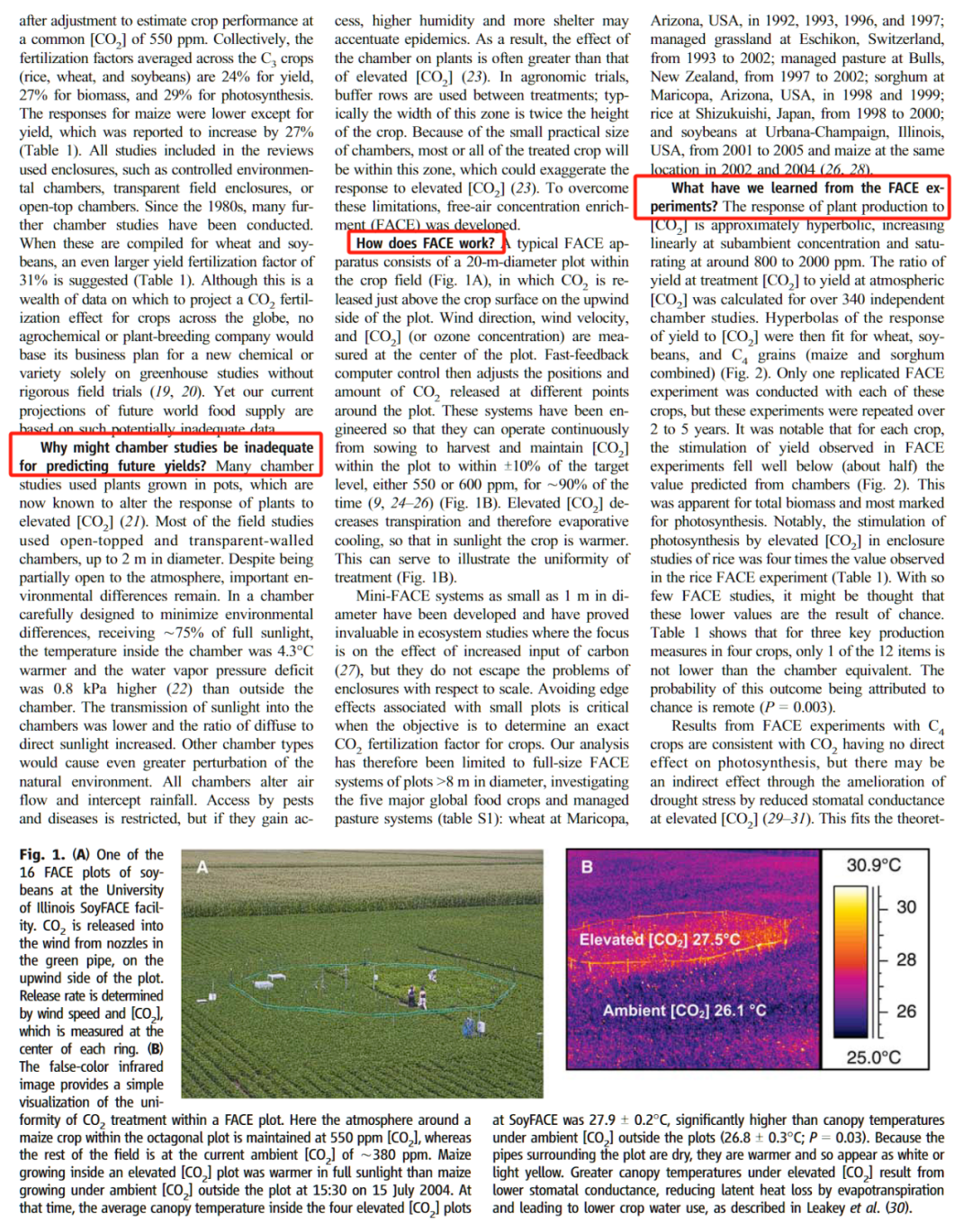 论文的前1-3段落不难看出就是常规论文的Introduction部分,整体围绕论文的背景而展开,第一段阐述了IPCC (全球跨政府气候变化委员会) 的预测,即他们认为全球总体的农作物产量其实会略微增加;第二段阐述IPCC的预测是基于什么数据和研究的出来,以及这些数据和研究有哪些不足之处;第三段重点解释为什么IPCC会做出此类预测以及其原理是怎样。三个段落层层递进,一步步引导读者产生疑问,并刚好在下文把读者的疑问在段落的小标题处提出来:How have CO2 fertilization factors been derived? And why might chamber studies be inadequate for predicting future yields? 用目前网络上流行的话语来说就是,作者预判了读者的预判。