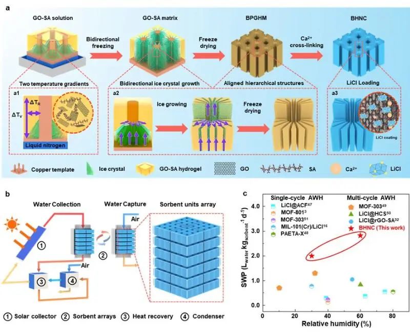 双定向分级多孔结构吸附材料的制备及规模化空气取水性能。(a) 双温度梯度诱导冰晶生长合成双定向分级多孔结构吸附材料的制备方法 (b) 基于双定向分级多孔结构吸附材料组装整列的规模化空气取水装置示意图 (c)不同相对湿度工况下空气取水性能比较