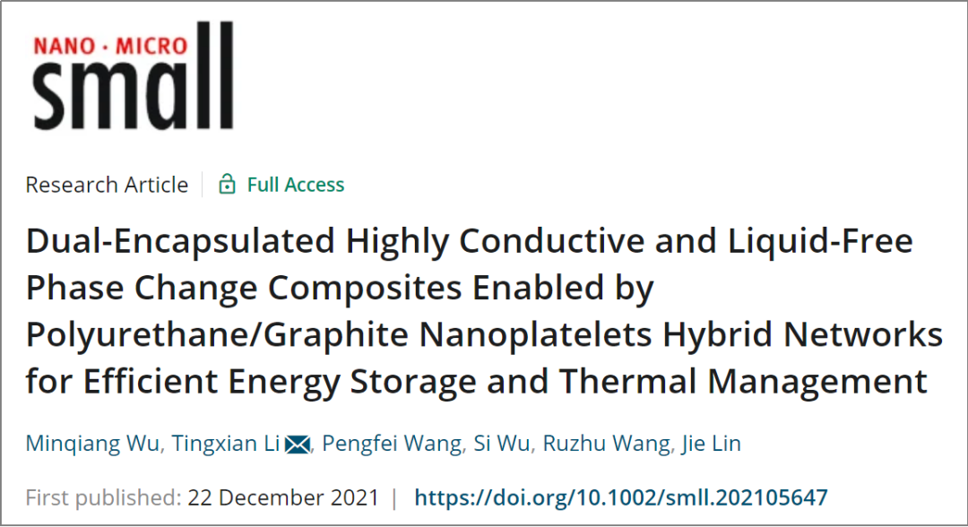 Minqiang Wu, Tingxian Li,* Pengfei Wang, Si Wu, Ruzhu Wang, Jie Lin. Dual-Encapsulated Highly Conductive and Liquid-Free Phase Change Composites Enabled by Polyurethane/Graphite Nanoplatelets Hybrid Networks for Efficient Energy Storage and Thermal Management. Small 2021, 2105647.