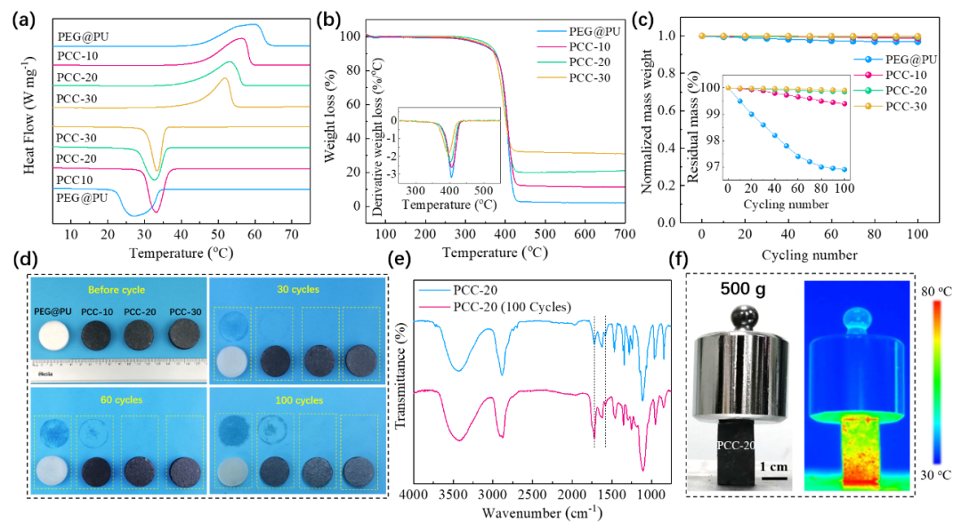 图2. PCC的相变行为表征和热稳定性测试。(a)DSC曲线;(b)DTG曲线;(c)PCC循环质量变化;(d)PCC循环泄露对比;(e)循环前后FTIR曲线;(f)PCC相变过程机械性能测试。