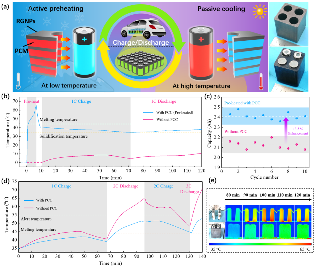 图4.(a)基于PCC的电池热管理策略;(b)低温环境下PCC电-热转化预热与无PCC的电池温度发展曲线;(c)低温环境下预热后电池容量对比;(d)高温环境下包裹PCC热管理器件的电池组与无PCC的电池温度发展曲线(e)红外图像对比。