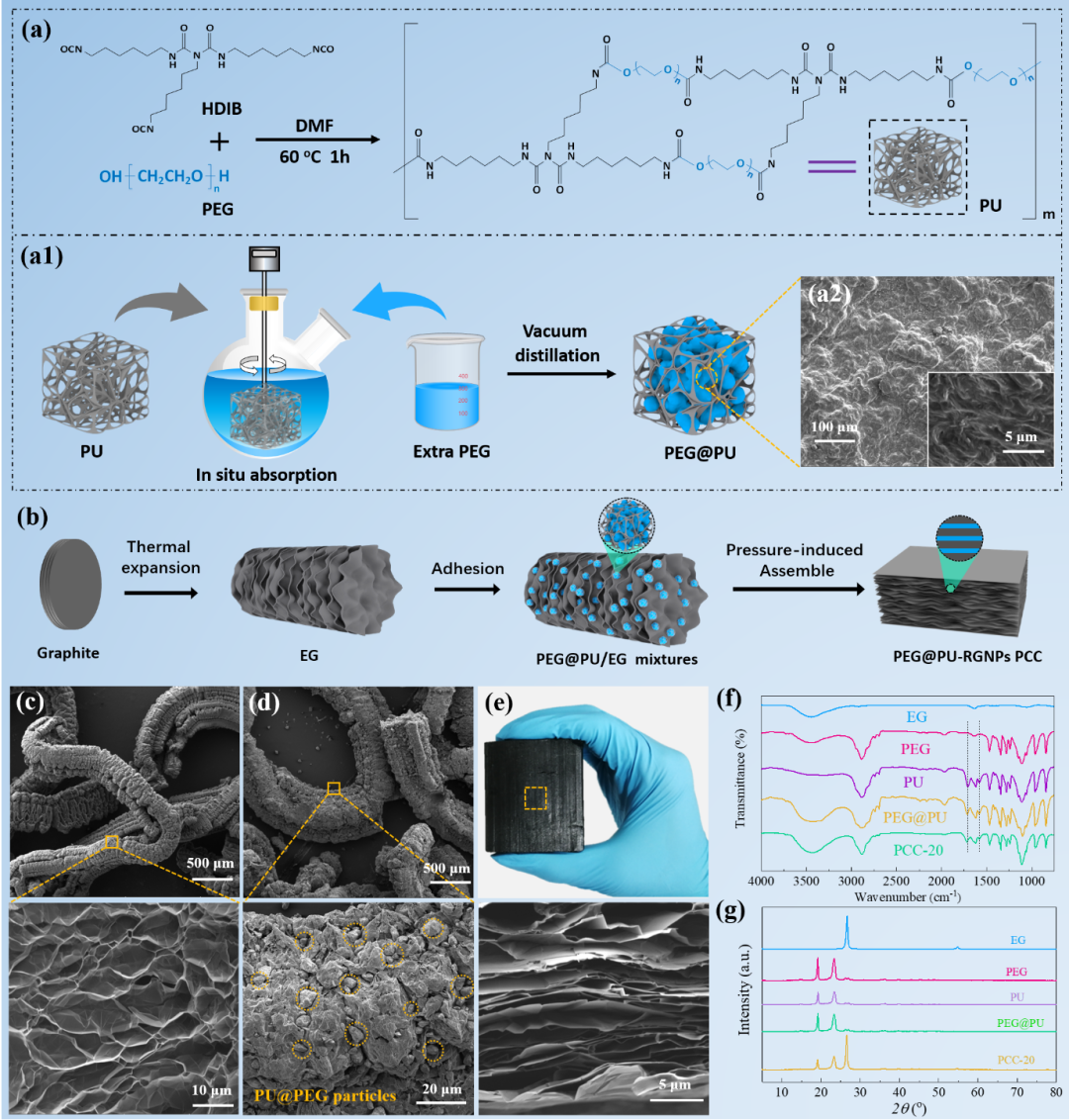 图1. 双网络封装相变复合材料合成示意图。(a)PU;(a1)PEG@PU;(a2)PEG@PU微观形貌;(b)PEG@PU-RGNPs(c)蠕虫状膨胀石墨形貌。(d)PEG@PU颗粒均匀分散在膨胀石墨表面(e)去除相变材料后层状RGNPs结构(f)FTIR曲线;(g)XRD曲线。