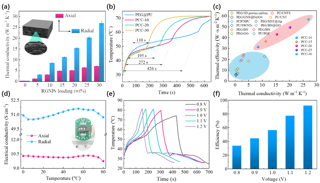 热导率测试表明PEG@PU材料内部具有各向异性的热导率。其中,垂直于压力方向(Radial)的热导率远高于轴向(Axial)热导率(图3a)。PCC两个方向的热导率均随RGNPs含量的增加而增大,但垂直压力方向的热导率增量远高于轴向,即PCC热导率各向异性随添加剂含量增加而增强。PCC的瞬态温度响应(图3b)表明,高 RGNPs含量下的PCC热响应更为迅速,温度增长速率加快,表明RGNPs含量的增加显著提高了PCCs的传热性能。通过对比,PEG@PU-RGNPs复合材料不仅具有优异的热导率,并且在相同热导率下展现出更高的热效能(图3c)。构建的RGNP骨架作为传热通道提高PCC热导率的同时,其构成的导电渗流网络大大增强了PCC的导电性能。测试结果表明PCC同样具有各向异性的导电率,其中径向电导率(51 S/cm)约为轴向电导率(10 S/cm)的5倍。通过对材料施加恒定电压(0.8-1.2 V),制备的PCC能够实现直接电-热转化与存储(图3e)。并且,当驱动电压上升至1.2V时,PCC的电热转换效率从最初的33.6%增加到92.1%(图3f)。