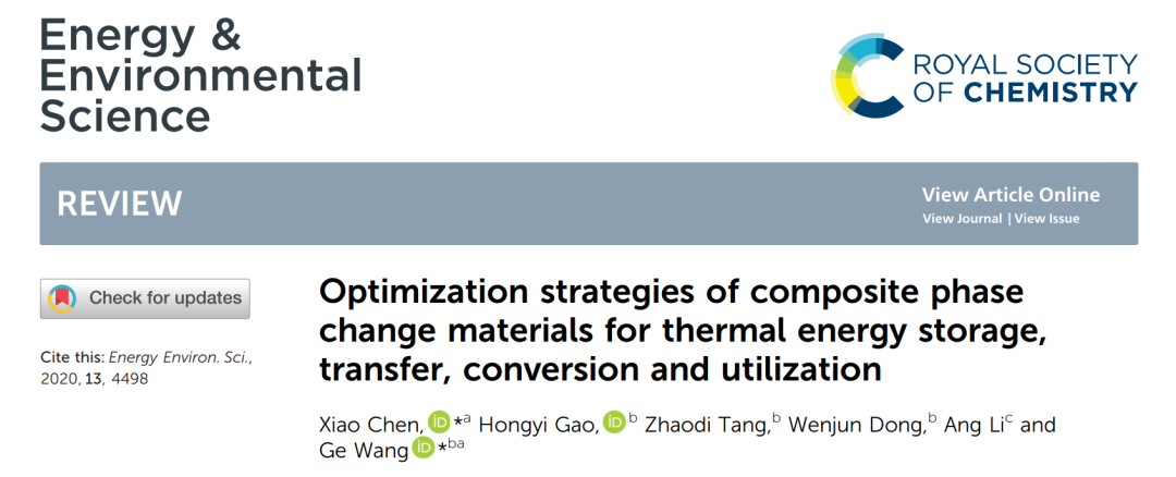 然而,应用最广泛的固-液相变材料存在一些缺点,包括相变过程中的液体泄漏、低导热性、低导电性。为了克服这些缺点,研究者开发了许多高导热、高导电的多功能载体材料来封装固-液相变材料,制备成定型复合相变材料和微纳胶囊。这些复合相变材料可以实现多种能量转换应用,如光热转换、电热转换、光热电转换、磁热转换、声热转换,这将促进多功能热能存储系统的发展和间歇性可持续能源的利用。2020年9月,北京科技大学王戈&北京师范大学陈晓团队以“Optimization Strategies of Composite Phase Change Materials for Thermal Energy Storage, Transfer, Conversion and Utilization”为题在《Energy & Environmental Science》(影响因子:39.714)上发表综述文章,系统总结了复合相变材料在储热、传热、能量转换和先进应用等方面的优化策略。