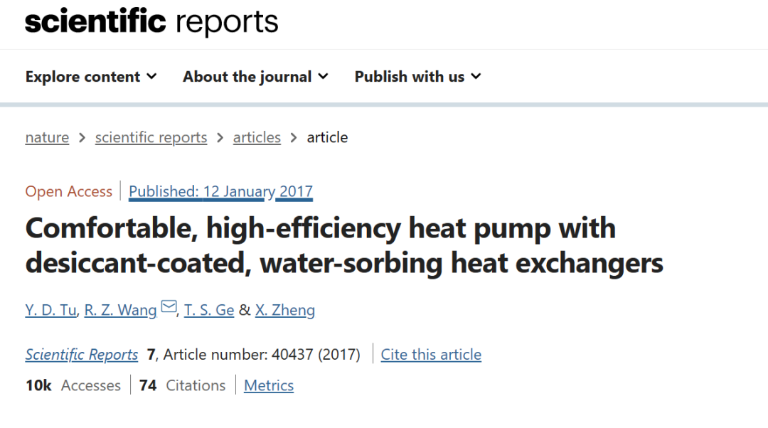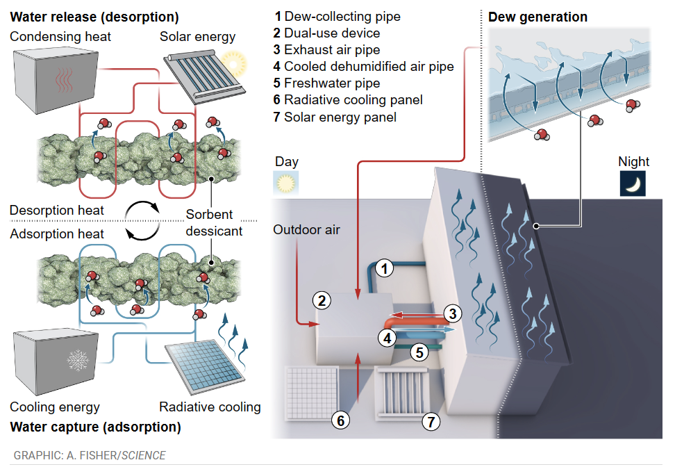 然而,水蒸气冷凝过程的效率是一个很大障碍。一个被称为性能系数(COP)的既定品质因数代表了产生的有用冷却能量与提供的功的比值。一般而言,冷水机的COP取决于热端(TC)和冷端(TE)之间的温度差。空调需要空气除湿,但水蒸气结露会引入更大的温差,从而降低了COP。这可能需要重新审视这个过程中的湿度管理。协同和多功能效应可以通过关注空气 - 水 - 能量关系来实现,主要由水与空气分离驱动。从空气中抽取水蒸气可实现空气除湿,同时还创造了淡水源。一些研究已经证明,在潮湿的气候条件下,通过将潜热和显热冷却解耦,能源效率可以提高两倍以上。将水蒸气捕获过程从显热冷却中分离出来,引发了一个有关促进高效冷却和淡水生成的两用装置的可行性的相关问题。尽管从经济和性能效率的角度来看,在炎热和潮湿的地区,设备的双重性质是相对简单的,但在炎热和干燥的地方部署这些系统存在严重的挑战。干旱地区通常拥有充足的自然阳光,提供了一种可持续的方式来增加或减少材料相对于环境的内能。湿材料的温度升高会加速干燥过程,水蒸气会释放到环境中。相比之下,根据菲克定律,由于水浓度差异,吸湿性多孔材料从大气中捕获水,促进了该过程的可逆性。2017年,一项概念验证显示,在室外干旱条件下,使用多孔金属有机框架从空气中收集水。在短短几年内,大气集水突飞猛进的发展,即使在沙漠环境中,迅速融合到连续操作的设备,不仅通过吸附剂干燥剂,而且还使用白天辐射冷却材料,通过重新设计现有的设备,实现现有的具有冷却功能的采水器的双重用途。由于固有的材料和传热特性,干旱地区的可持续冷却需要一个两步法(见图)。低于环境温度的吸附剂可降低室外空气温度,同时促进水分捕获,最终形成冷却和除湿的空气。由于吸附过程会产生热量,因此可以使用辐射冷却或基于干燥剂的热泵带走显热和吸附热,后一种装置的加入具有从蒸发器中处理的空气中吸附水分的能力,引入了冷却吸附除湿,从而产生舒适的空气。通过利用固有热泵功能同时产生冷却和加热能量,冷凝热作为副产物不会被浪费,而是用于加热解吸过程。因此,蒸发量升高,以及减少冷凝的温度,都会产生了积极影响。因此,传统空调设备中由低温蒸发冷却处理的潜热负荷可以通过基于吸附技术的系统进行管理,其中吸附剂材料可以通过太阳能加热或热泵冷凝热量再生,对设备性能产生积极影响。另外,太阳能,再加上热能储存的技术进步,成为另一个潜在的来源。收集液态水的最后一步是通过热途径在高温水蒸气和散热器之间进行能量交换。太阳能可以在水的相变过程中发挥重要作用。一般而言,在屋顶上部署的辐射涂层在干旱地区可能会有所帮助,并且可以减轻两用设备或建筑物传统空调的一些负担。此外,在极端干燥的环境条件下,从人类或其他湿源以潜热负荷大规模回收室内废气,可以成为另一种水源。这种空气湿度回收已经在航天器或空间站中用于为宇航员提供长达数月或全年的水。全年多变的环境和室内条件需要灵活的设备适应性策略。例如,对金属有机框架逐步位置的精确调节显示出在相对湿度低至10%的恶劣环境条件下运行的前景。在微米和纳米尺度上,吸附剂孔体积的实时操纵有望带来可调的吸水行为和解吸温度。相比之下,辐射涂层可以利用可切换的温度调制热发射,扩展两用设备的使用场景,提供全年的热舒适性。在评估设备时,需要就相关指标达成共识,以便将有用的产品与所提供的工作联系起来,这使得规划前进道路更加困难。除了辐射冷却、太阳能和总面面积之外,其他因素,如总重量和吸附剂重量,可能会增加另一层,以确保竞争设备的比较有公平的基础。此外,应在全球范围内对干旱和半干旱地区的两用装置进行评估,以明确显示广泛部署的潜力。这样的工程机会需要进一步的定量分析和更深入的物理见解,并清楚地描述与传统一次性设备的理论和实践改进。广泛实施双重用途方法可能会遇到各种挑战。其中之一是由于相对湿度较低,吸附剂捕获水的可能性降低。提高吸附剂吸附速率和动力学的有效解决方案是使用复合材料,并调节蒸发温度。通过结合这些材料和系统级策略,可以大大提高吸附剂吸附水的潜力。相比之下,大气中较低的水分含量可以提高辐射天空冷却材料的性能。由于在单一的两用设备中收集大气水的可持续冷却与各种技术相连接,因此需要特别努力寻找商业吸引力的最佳解决方案,以及可持续生活的低碳道路。