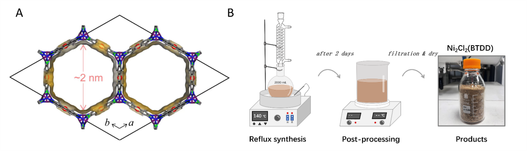 图2. Ni2Cl2(BTDD)结构及合成示意图。(A) Ni2Cl2(BTDD)的结构/孔道图;(B)回流合成法示意。