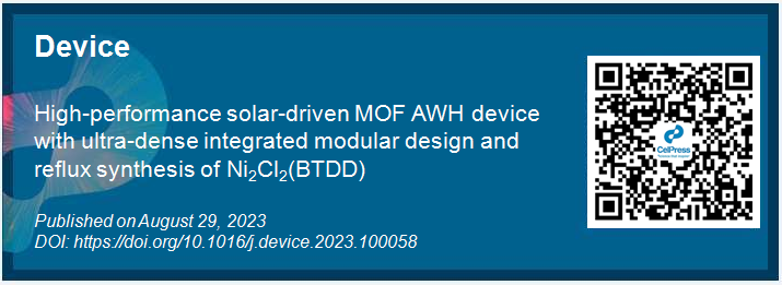 2023年8月29日,相关成果以“High-performance solar-driven MOF AWH device with ultra-dense integrated modular design and reflux synthesis of Ni2Cl2(BTDD)”为题发表在Cell Press细胞出版社旗下期刊Device上。上海交通大学博士研究生邵昭与中山大学硕士生唐玉成为论文第一作者,上海交通大学王如竹教授与中山大学张杰鹏教授、周东东副教授为该论文通讯作者。