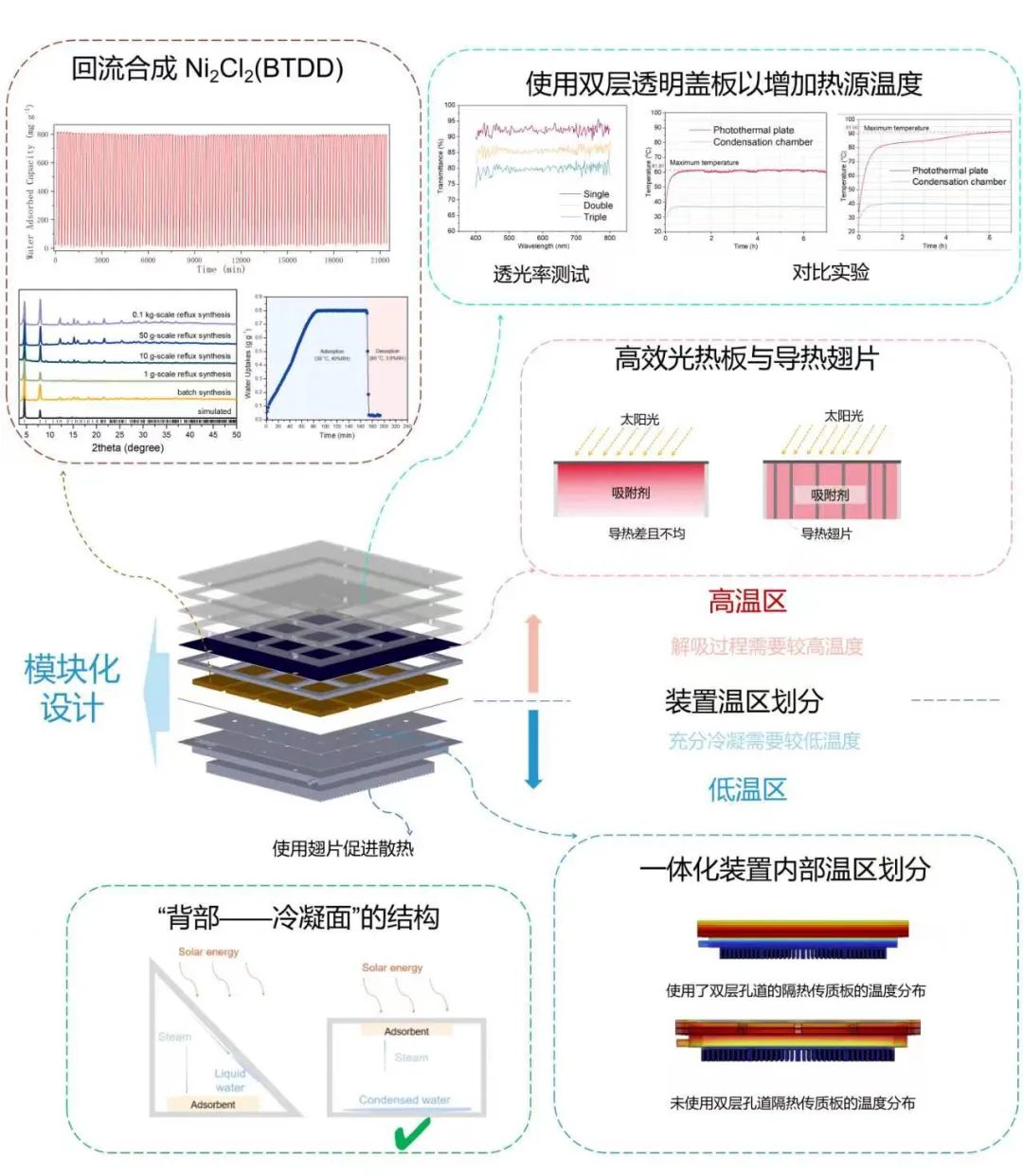 基于批量化合成的高性能吸附剂Ni2Cl2(BTDD),该研究开发了一种可扩展的模块化高性能纯被动式太阳能空气取水器。该研究中首先分析了空气取水的热需求:在吸附剂的解吸阶段吸附剂侧需要高解吸温度以实现吸附剂中水蒸气的释放,而释放出的水蒸气则需要一个温度尽可能低的冷凝面,这一技术路径决定了在空气取水装置中的不同部位必然存在着相反的温度需求。在过去的研究中为了展示空气取水的可行性,研究人员通常使用电力驱动的辅助装置从上述两个角度出发提升装置性能,例如采用电加热或聚光装置提升热源度以及利用电制冷装置或空调降低冷凝温度。这些研究展示了空气取水技术的巨大潜力,但是大量辅助设施的应用不利于商业化的推广,同时现有研究大多基于较小尺度的展示,并没有针对实际需求进行模块化的优化。