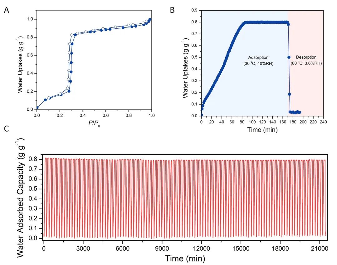 图3. Ni2Cl2(BTDD)吸附/脱附测试。(A) 吸附等温曲线;(B)在使用工况下(40% RH,30 ℃吸附;3.6% RH,80 ℃脱附)的吸脱附曲线;(C)百次吸附/脱附循环稳定性测试。