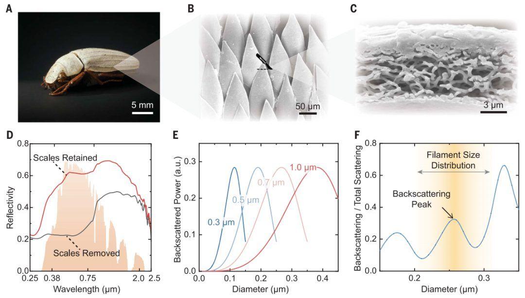 另一方面,由于太阳(5800 K)发出的电磁辐射强度比室温物体(288 K)高11个数量级,因此太阳辐射主导了白天冷却器的辐射热交换。Cyphochilus作为一种原产于东南亚的甲虫,是地球上已知最白的昆虫。作者从这种甲虫错综复杂的生物结构中学会了如何设计一个坚固的陶瓷式冷却器。在对甲虫鳞片散射系统的研究的基础上,本文的冷却陶瓷被设计为具有多级多孔结构,从而产生了近乎理想的RSolar。该冷却器易于制造,既不需要精密仪器,也不需要细致的参数调节,并且具有出色的日间冷却性能,从而降低了室内冷却的能耗。