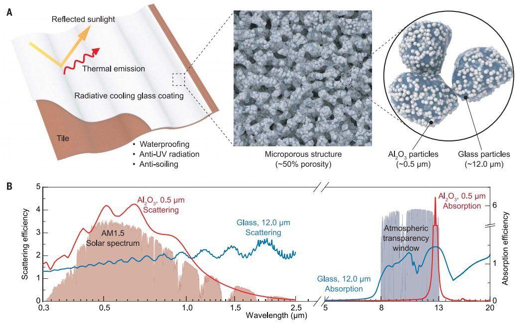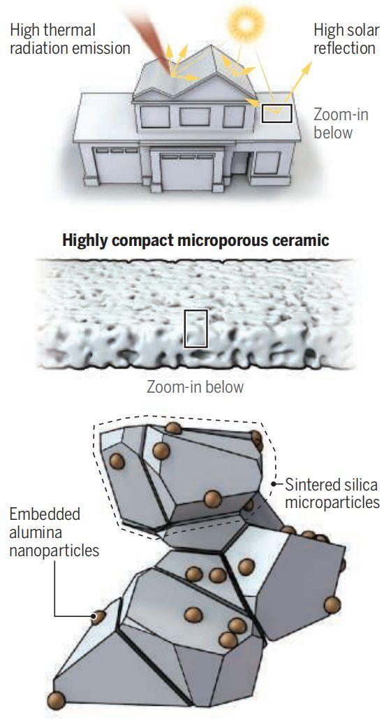 图1. 建筑设计材料,包括屋顶瓦,可以涂上微孔陶瓷(如二氧化硅和氧化铝),可以强烈反射阳光并发出热辐射