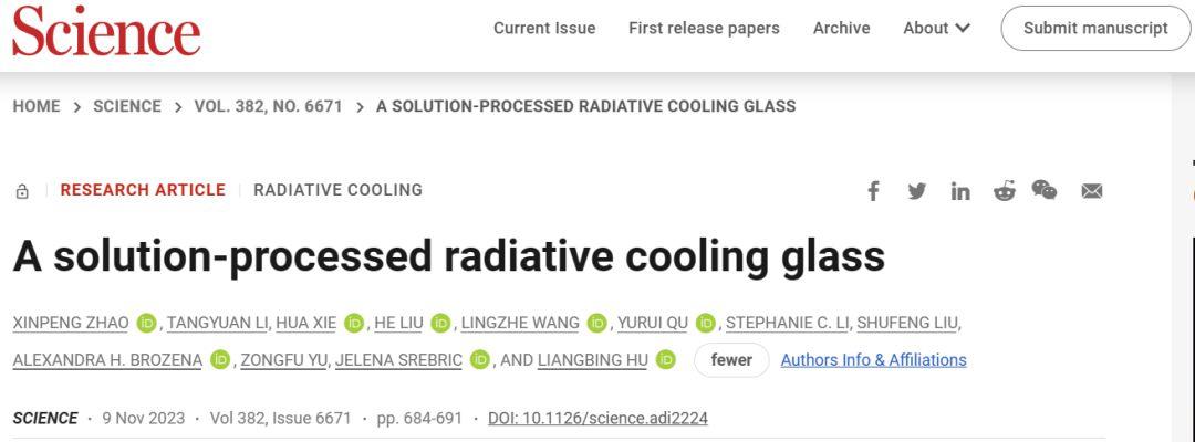 相关文章以“A solution-processed radiative cooling glass”为题发表在Science上。