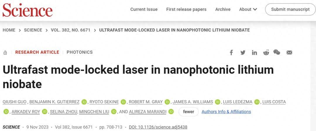 一、加州理工学院郭秋实Science:纳米光子铌酸锂中的超快锁模激光器