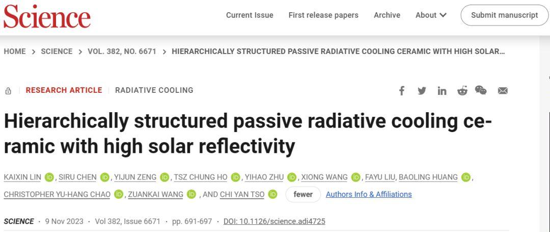 二、Chi Yan Tso和王钻开教授Science:具有高太阳反射率的分层结构被动辐射冷却陶瓷