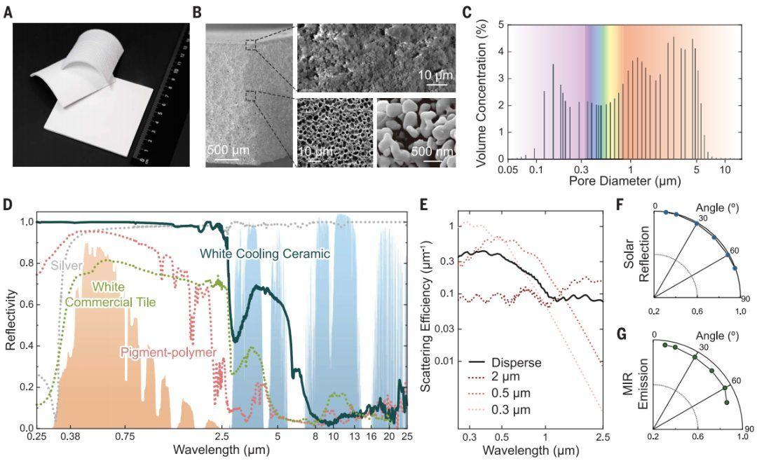 基于纳米光子结构的被动辐射冷却受到其高成本和与现有终端用途的兼容性差的限制,而聚合物光子替代品缺乏耐候性和有效的太阳反射。在此,香港城市大学Chi Yan Tso教授和香港理工大学王钻开教授等人开发了一种可以实现高效光散射和接近完美的太阳99.6%的反射率,再加上较高的热发射率,使陶瓷能够在室外环境中提供持续的亚环境冷却,在中午的冷却功率为每平方米130瓦,展示了在全球范围内的节能潜力。颜色、耐候性、机械坚固性和抑制莱顿弗罗斯特效应的能力是确保冷却陶瓷耐用和多用途的关键特性,从而促进其在各种应用中的商业化,特别是商业化建筑。 相关文章以“Hierarchically structured passive radiative cooling ceramic with high solar reflectivity”为题发表在Science上。