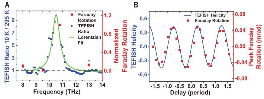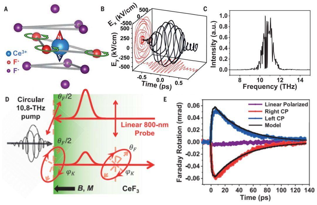 时间反演对称性(TRS)对于材料的光学、磁性、拓扑和传输特性至关重要。手性声子的特征是原子围绕其平衡位置单向旋转,产生破坏TRS的动态晶格结构。在此,美国莱斯大学朱涵宇助理教授等人报道了由圆偏振太赫兹光脉冲驱动的相干手性声子,以类似于1特斯拉量级的准静态磁场的方式极化氟化铈中的顺磁性自旋。通过时间分辨法拉第旋转和克尔椭偏率,作者发现瞬态磁化强度仅由与声子共振的脉冲激发,与声子的角动量成正比,并在低温下随磁化率增长。这一观测结果在定量上与自旋-声子耦合模型相吻合,并可能为研究超快磁性、节能自旋电子学和TRS断裂物质的非平衡相提供新的途径。