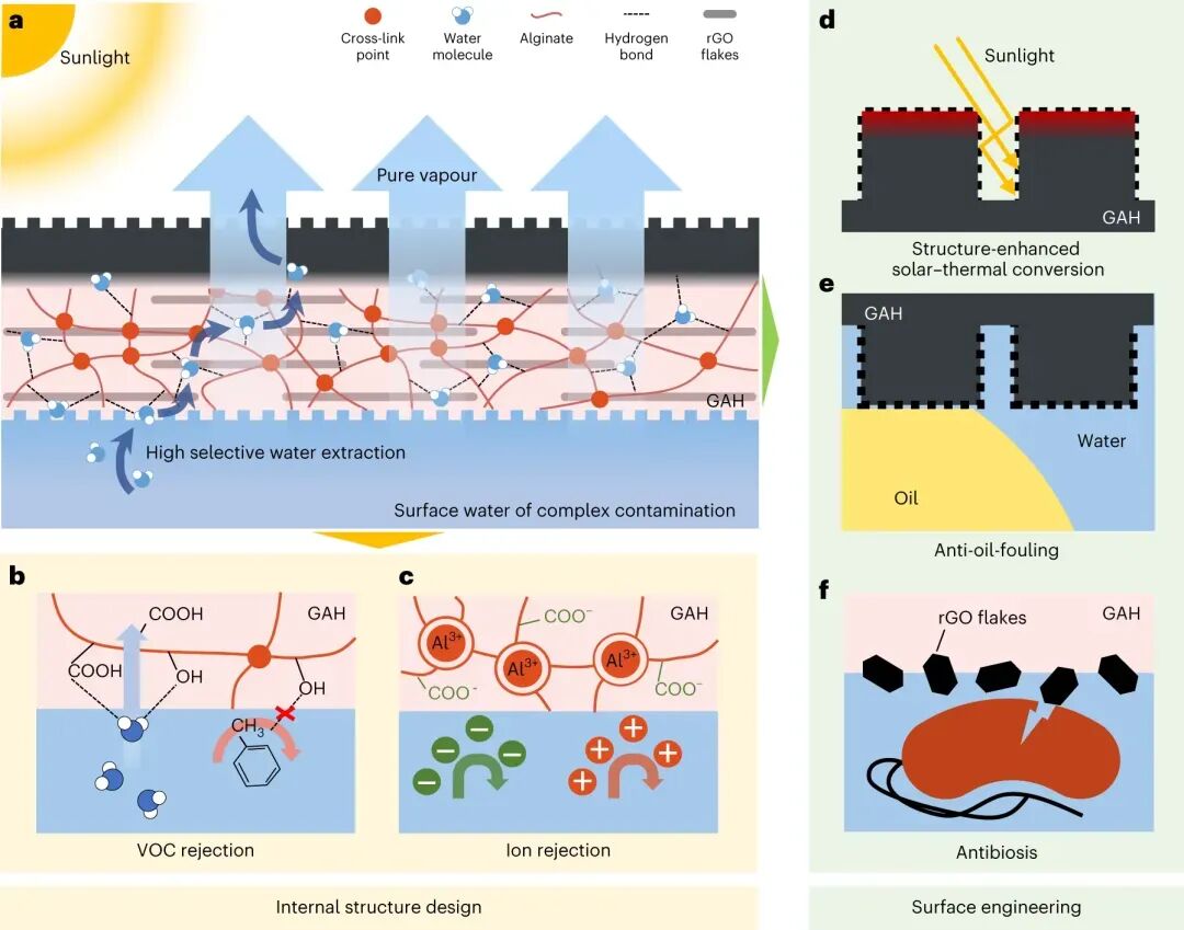 1. 在这篇工作中,作者开发了一种基于太阳能石墨烯/藻酸盐水凝胶(GAH)的清洁水提取器,其具有超强的抗复杂污染物传输能力和超强的防污能力。