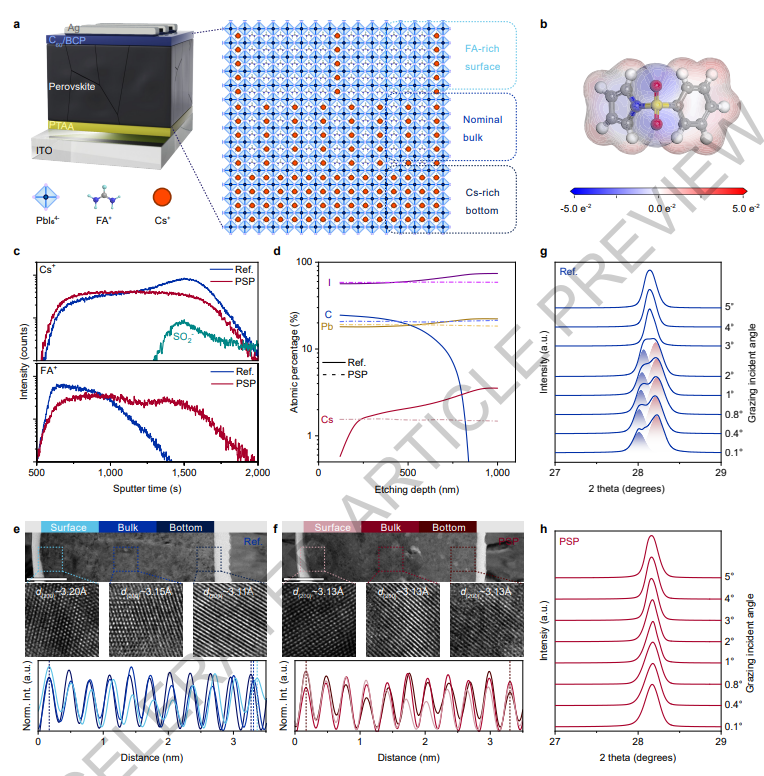 2. 作者团队设计了1-(苯基磺酰基)吡咯(PSP)分子以弥补不同阳离子间的结晶与相转速率差,制备出均匀化的钙钛矿薄膜。这种阳离子组分均匀分布的钙钛矿薄膜有效抑制了由底部富Cs相带来的准I型能级排列,很大程度上提升了载流子寿命及扩散长度,加强了载流子界面抽取。