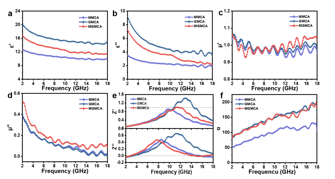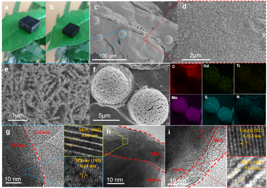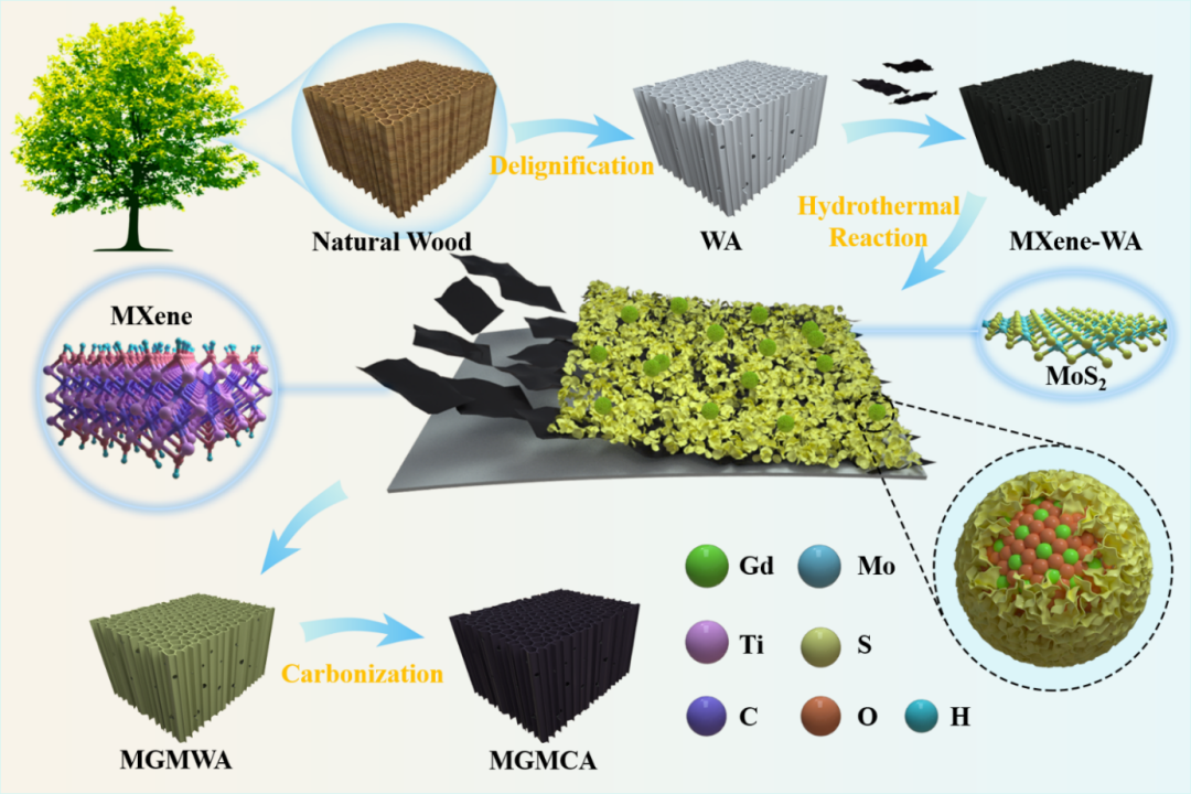 针对上述问题,陕西科技大学“生物质化学与材料”院士创新团队沈梦霞副教授课题组以具有定向多孔结构的天然木材作为框架,采用自上而下的方法制备了木质气凝胶。随后,结合具有高介电常数的MXene和磁性的稀土氧化物Gd2O3,并以MoS2纳米片进行表面包覆,以此形成多个异质界面,实现阻抗匹配和多种电磁波损耗机制。通过这种方法成功制备了具有磁-介电协同和多层结构的MoS2@Gd2O3/Mxene多孔碳气凝胶复合材料(MGMCA)。本项工作通过合理的结构设计和多元复合材料的构建,制备了一种天然木材衍生的电磁波吸收材料,所制备的复合材料表现出优异的电磁波吸收性能,在仅1.9毫米的超薄厚度下,最小反射损失可达到-57.5 dB,并具有4.35 GHz的有效吸收带宽。