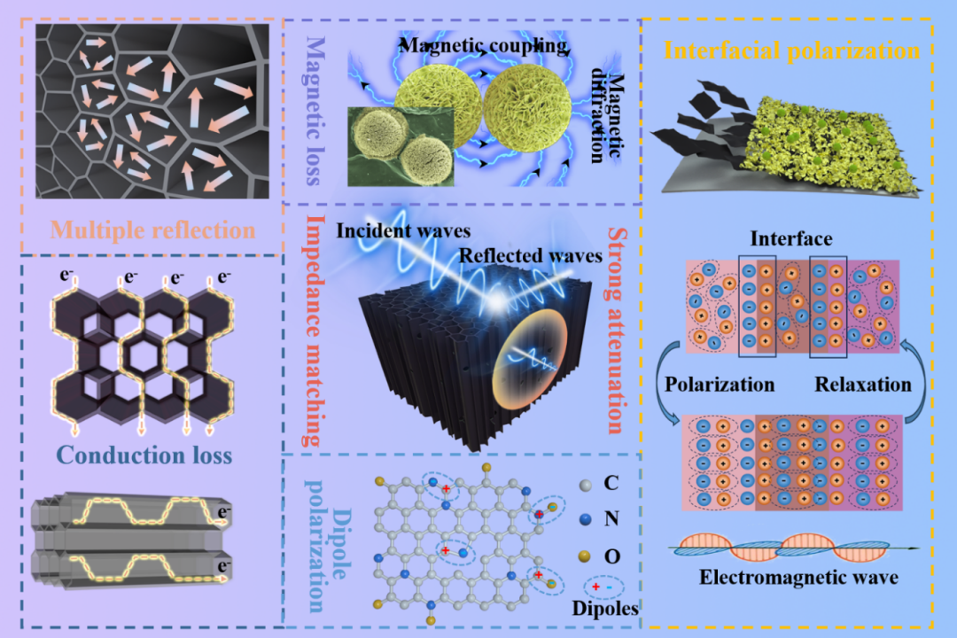 随着无线通讯的广泛使用和电子设备精密度与灵敏度不断提高,对能有效解决电磁污染问题的电磁波吸收材料提出了更高的要求。良好的阻抗匹配和强的电磁波损耗是电磁波吸收材料基本要求;合理的结构设计可以产生多层次的空间结构和不均匀的界面,有利于优化电磁波的传播路径,实现额外的电磁波能量损耗。而多元复合材料能够发挥各组分材料的优势,避免不平衡的阻抗和单一的损耗机制,可以有效减少电磁波的表面反射并增加入射波的损耗。因此,材料的多尺度结构设计和多元复合材料的合理构建是改善电磁波吸收性能的有效策略。天然的生物质材料经历亿万年的演变,呈现出各种各样独特的结构,通过简单的处理,可以在保持天然生物质材料本身形态结构的同时实现材料的功能化,有效避免结构设计带来的问题。