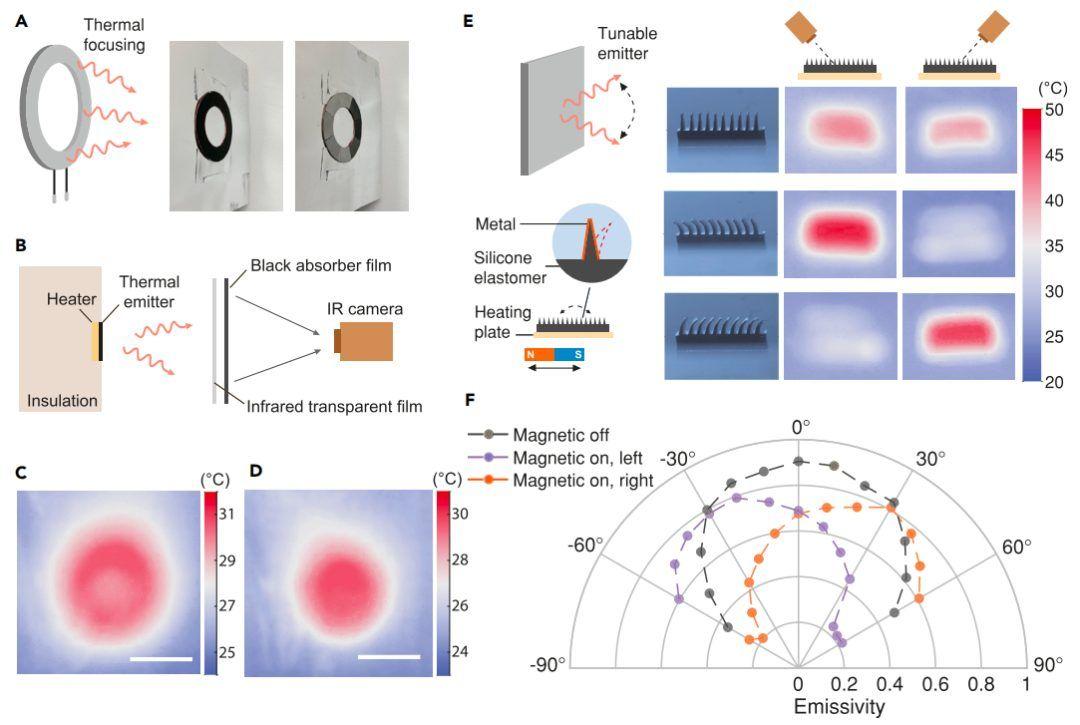 由于高发射率的角范围有限,角度选择性发射器可以向需要加热的目标发射热辐射,同时最大限度地减少对其他不需要的方向的辐射,从而降低加热能耗。为了证明定向发射器的这种能力,作者制造了一个环形发射器(图4A)。为了可视化辐射分布,构建了一个装置来捕获热辐射并将其转化为温度分布(图4B)。图4C和4D比较了从各向同性和定向发射器捕获的红外图像。相比之下,对于定向发射器,由于楔形方向,只有当发射方向指向中心时,发射率才大。因此,大多数辐射热通量朝向观察到最大温度升高的中心(图4D)。原则上,楔形方向也可以是空间不均匀的,因此可以进一步优化辐射加热范围。