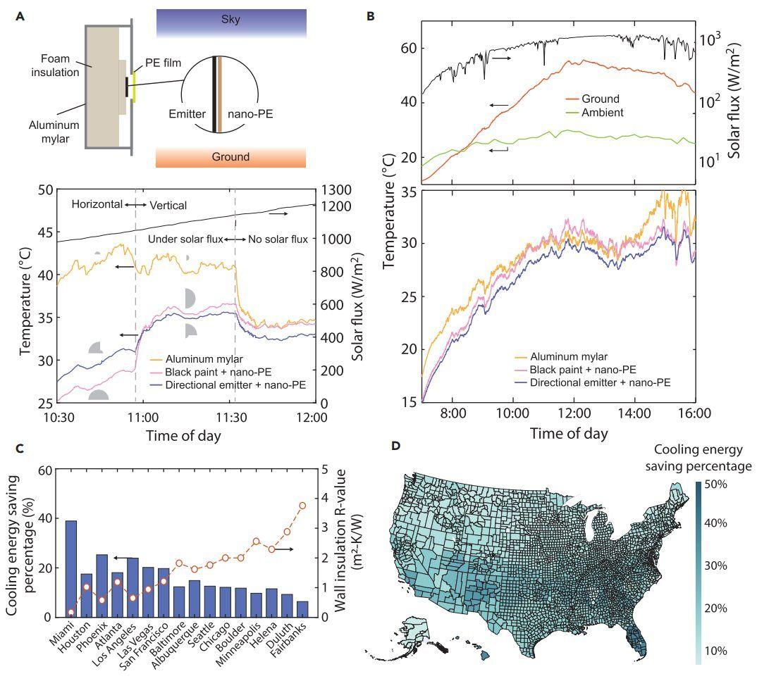 图3A显示了用于比较具有不同发射率分布的材料的冷却性能的室外设置,进一步进行了全天测试。在日出之前,由于辐射冷却,对照组炭黑涂料和实验组定向发射器都达到低于环境温度的温度,而铝聚酯薄膜则保持在环境温度附近。太阳升起后,地面温度开始升高。当地面温度高于环境温度时,炭黑涂料会受到额外的加热损失,并且与定向发射器相比,它们的温度越来越高。中午前后,当地面温度达到最高时,炭黑的温度甚至高于聚酯薄膜铝膜,这凸显了由于地面热辐射而产生的明显加热。在一天中,定向发射器达到所有样品中最低的温度,展示了定向发射率在冷却节能方面的优势。