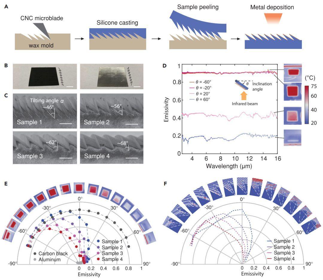 为了量化与角度相关的热发射率,作者使用傅里叶变换红外光谱仪来测量发射率光谱。结果显示,本文的微观结构设计实现了发射率的宽带对比度,从一个方向的约0.9到另一个方向的约0.1。因此,红外热像仪下的样品外观从暖色(红色)变为冷色(蓝色)。实验数据表明,当楔形顶面的倾斜角从约46°(样品1)变为约68°(样品4)时,高发射率被缩小到更小的角度范围(图2E)。