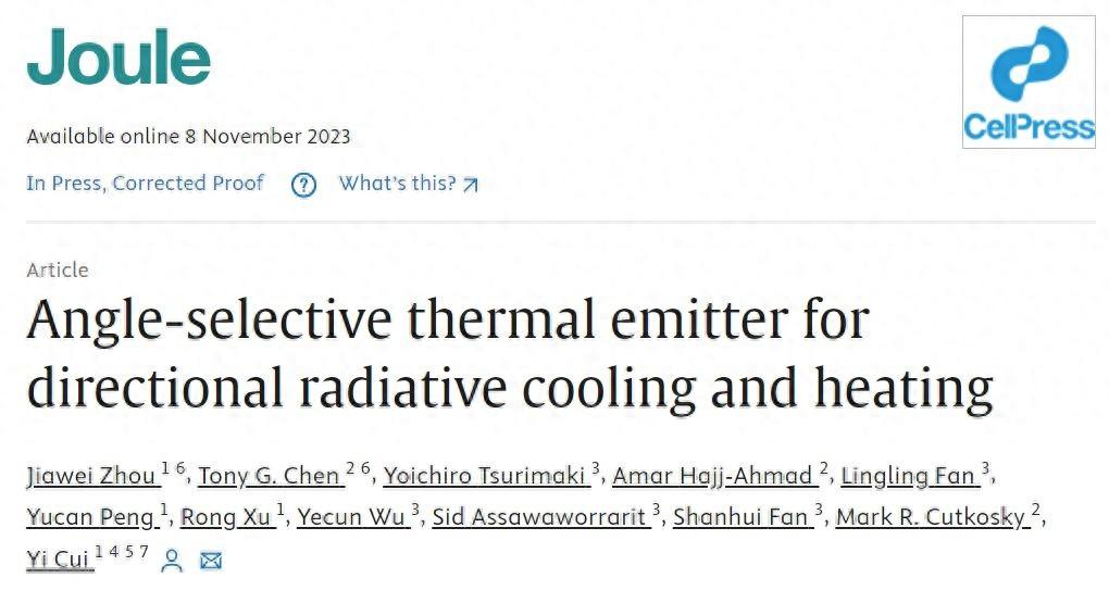 Jiawei Zhou, Tony G. Chen, Yoichiro Tsurimaki, Amar Hajj-Ahmad, Lingling Fan, Yucan Peng,Rong Xu, Yecun Wu, Sid Assawaworrarit, Shanhui Fan, Mark R. Cutkosky, and Yi Cui*, Angle-selective thermal emitter for directional radiative cooling and heating, Joule. (2023). https://doi.org/10.1016/j.joule.2023.10.013