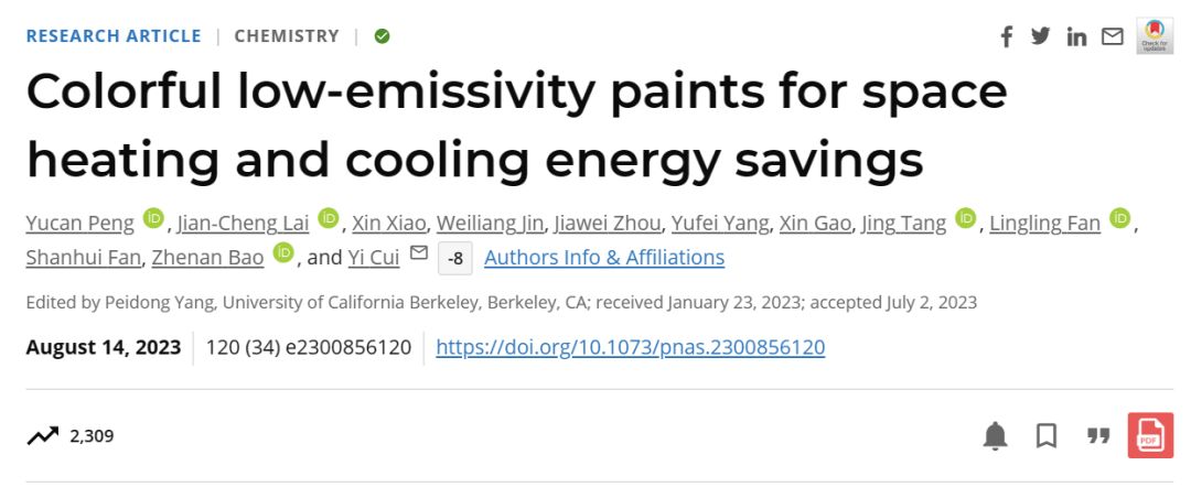 实际上,在今年8月,崔屹教授已经在PNAS上以“Colorful low-emissivity paints for space heating and cooling energy savings”为题报道了一种通用的彩色低辐射涂料,以形成由红外 (IR)反射底层和彩色红外透明顶层组成的双层涂层。丰富多彩的视觉外观保证了与传统涂料相媲美的美学效果,实现了高中红外反射率(高达~80%),是相同颜色的传统涂料的10倍以上,有效减少了来自外部环境的热量增加和损失。这些涂料的优点是在节能和全年供暖和制冷的损失之间取得平衡,提供适应各种气候带的全年节能解决方案,可实现正向供暖、通风、空调节能。