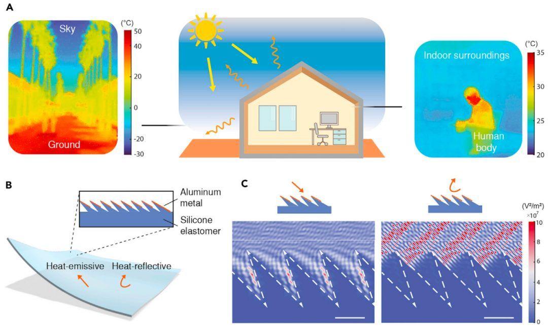 其中,被动日间辐射冷却已成为一种冷却物体(包括建筑物)的策略,其在8-13μm的大气透明窗口中应用具有高太阳反射率和高红外发射率的材料。近年来,光谱发射率工程也出现在个人热管理中,其中先进的纺织材料旨在传输或反射来自人体的热辐射,以促进个人热舒适。尽管当周围环境处于均匀和稳定的温度时,工程光谱发射率是有效的,但环境的温度在很大程度上是不均匀的,并且在许多实际情况下可能会动态变化。