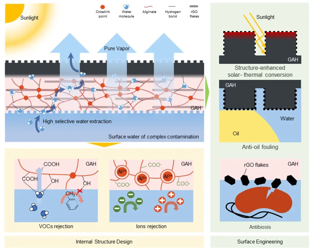 该研究基于鱼鳞启发的表面结构设计并通过高密度的聚合物网络调控,开发了石墨烯/海藻酸凝胶膜(GAH)。该膜由氧化石墨烯/海藻酸钠混合分散液经成膜、多次离子交联、化学还原及激光直写表面结构获得。通过多次交联循环制备工艺,GAH具有致密的聚合物分子链网络,其内部水分子以结合态存在,通过结合态水扩散形式实现水的净化,有效阻止污染物到达蒸发界面;同时,GAH致密聚合物分子网络上的含氧官能团会在吸水状态下发生可逆解离,在膜内部形成高渗透压,阻止污水中盐离子进入,进而实现高选择性水净化,防止长时间蒸发过程中的结盐问题。通过激光直写制备工艺,GAH具有类似鱼鳞的微纳表面结构,其局域几何结构吸光能力增强,并具有水下防油污能力及纳米片表面灭菌能力。