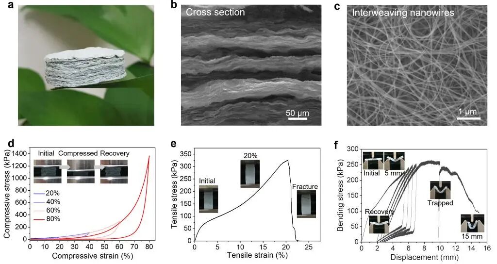 柔而强的陶瓷气凝胶 a)宏观形貌 b)截面层状结构 c)层内纳米线高度交联 d)压缩回弹性及高承载 e)弹塑性拉伸变形及高拉强度 f)可恢复的弯曲变形及高弯曲强度