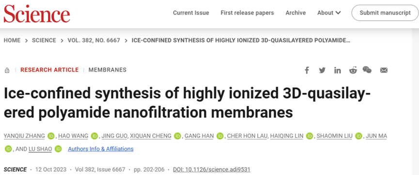 哈工大邵路教授团队 Science:“膜”法世界的冰雪奇缘 - 冰限域合成高度离子化三维准层状聚酰胺纳滤膜