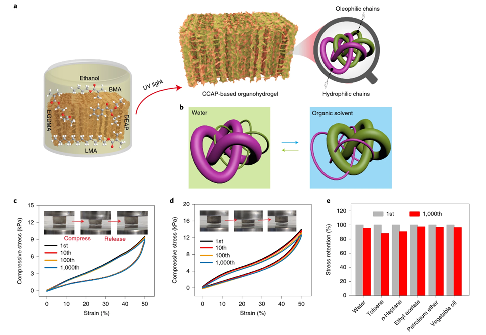 Due to the structure-favoured anisotropic response to tensile deformations coupled with elastic recovery, the hydrogel is endowed with sensing dimensions which allow the direction and velocity of movement on the sensor surface to be distinguished. In addition, by interpenetrating with an oleophilic polymer network, highly elastic and adaptive organohydrogels are developed with outstanding sensing performance in a wide variety of organic solvents and cryogenic temperatures. These materials may therefore be suitable for use in flexible and wearable devices in harsh environments.