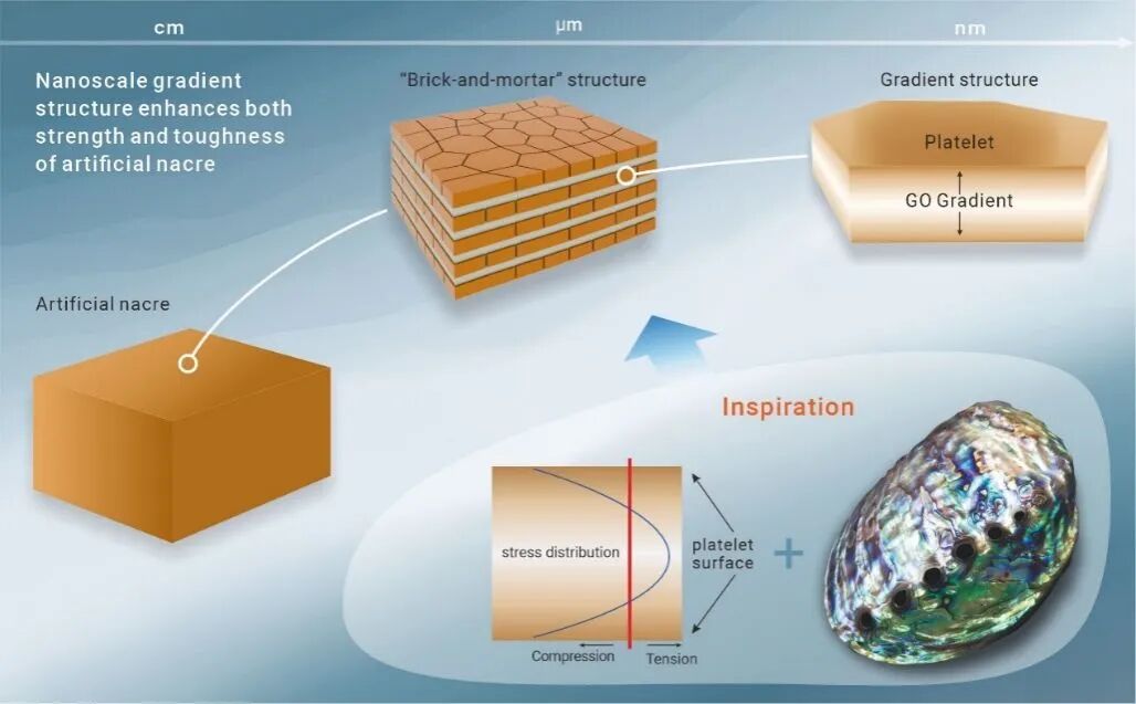 仿生结构陶瓷的实际应用需要在材料具有优异的性能。这项工作证明,通过在多级尺度上整合设计原则,无论这些原则是否运用仿生理念,都可以实现这一目标。此外,同时控制不同尺度的结构特征具有挑战性,而本研究利用矿化过程来实现这一目标。以矿物前驱体结晶为驱动力,使纳米片向基元片表面聚集,从而在矿物基元片中构建氧化石墨烯梯度。组分梯度在基元片表面引起压应力场,由此改善了基元片的硬度和强度;结合仿珍珠母微米尺度的层状结构的优点,最终在宏观尺度下表现出了比无梯度仿生珍珠母更高的断裂韧性。目前的工作证明了多尺度结构设计增韧的可行性,为实现多尺度结构设计的集成和超强结构材料的制备提供了一种可行的策略和思路。