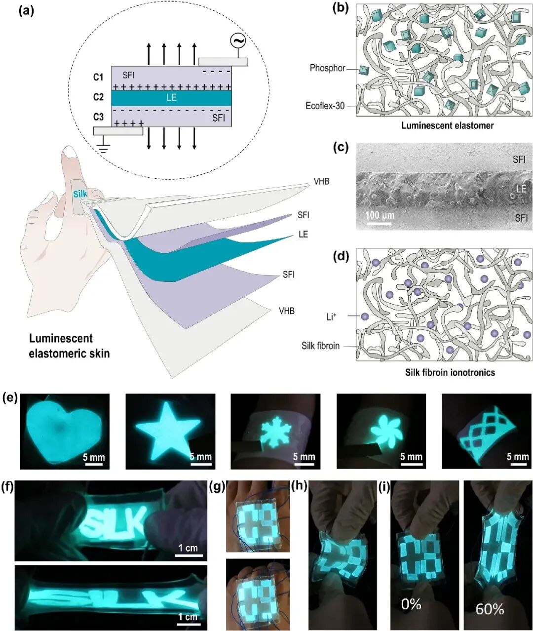 图1. (a) HIDP的结构和工作原理示意图;(b-d) 发光层、丝蛋白离子弹性体的结构示意图及截面SEM图像;(e-i) 各种图案的HIDP实物图以及在拉伸、弯曲等状态下的发光HIDP实物图。