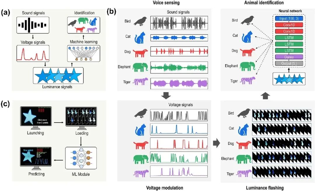 如图4a所示,我们使用Arduino开发板的程序设计和处理模块,通过对不同声音信号进行编码,将其转换为不同的电压强度和频率,以驱动HIDP的动态发光,实现了相应的亮度、颜色和闪烁频率等信息的可视化显示。此外,我们还利用机器学习技术来学习不同声源激发HIDP的动态显示过程,以用于识别各种声源。我们选择了五种不同动物物种的声音(鸟,猫,狗,大象和老虎)作为研究对象,这些声音激发了HIDP显示的周期性亮度变化,这些变化被用作机器学习分类模型的输入,通过使用递归神经网络(RNN)模型,我们成功地根据HIDP显示的亮度变化信息来识别动物物种(如图4b和4c所示)。经过200轮随机测试,HIDP对这五种动物声音的识别准确率达到了约100%。