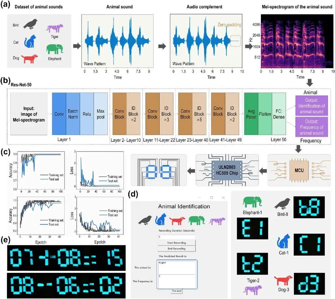 图5. (a) 用于为CNN模型建立数据集的音频信号处理的流程图;(b, c) 基于ResNet-50的CNN分类模型的结构示意图及准确率和损失曲线;(d) Tkinter界面和HIDP实时识别和显示动物声音的种类和频率 ;(e) HIDP实时识别和显示视听交互信息。