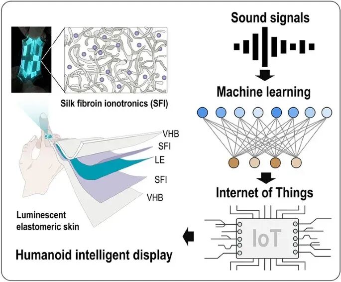 传统的显示技术在机械性能与智能化方面限制着人机交互的发展。本文提出基于丝蛋白离子弹性体,开发一种高度类似皮肤结构和机械性能的电致发光人形智能显示平台(HIDP)。最终,基于丝蛋白离子弹性体的HIDP表现出高拉伸性(700 %)、自愈能力,并且在极端环境和复杂机械刺激下在保持稳定发光状态。另外通过结合物联网与机器学习技术,HIDP实现了动物物种的视听交互和声音识别。