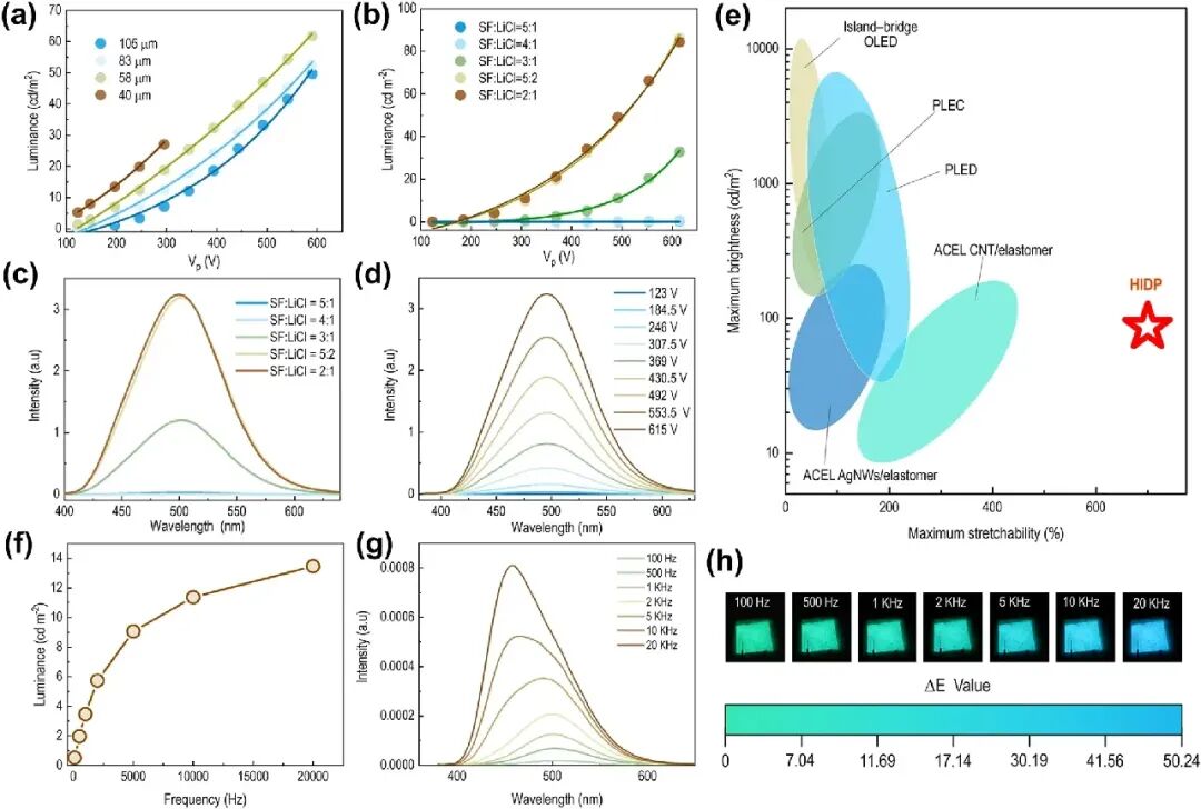 图3. (a-d, f, g) HIDP的亮度与激发电压、频率、厚度、锂含量的关系及相应的发射光谱图;(e) HIDP与其他代表性发光器件的可拉伸性和最大亮度的Ashby性能对比图;(h) 不同电压频率下的HIDP的颜色变化图像。