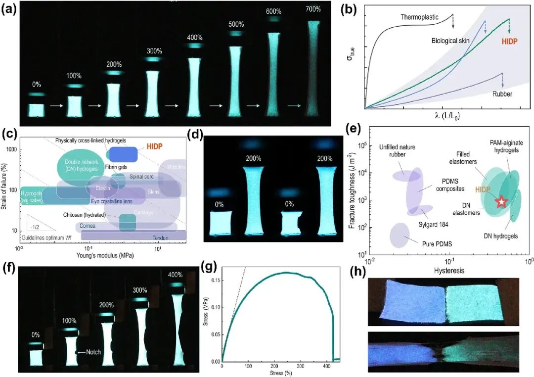图2. (a) HIDP在拉伸过程中不同应变下的发光图像;(b) HIDP、热塑性材料、生物皮肤和橡胶的真应力-应变曲线;(c) HIDP和其他具有代表性的离子电子学材料的杨氏模量和失效应变的Ashby性能对比图;(d) HIDP在循环拉伸过程中的发光图像;(e) HIDP和其他弹性体的滞后值和断裂韧性的Ashby性能对比图;(f-g) 带预缺口的HIDP在拉伸过程中不同应变下的发光图像及力学曲线;(h) 双色HIDP在不同应变下的发光图像。
