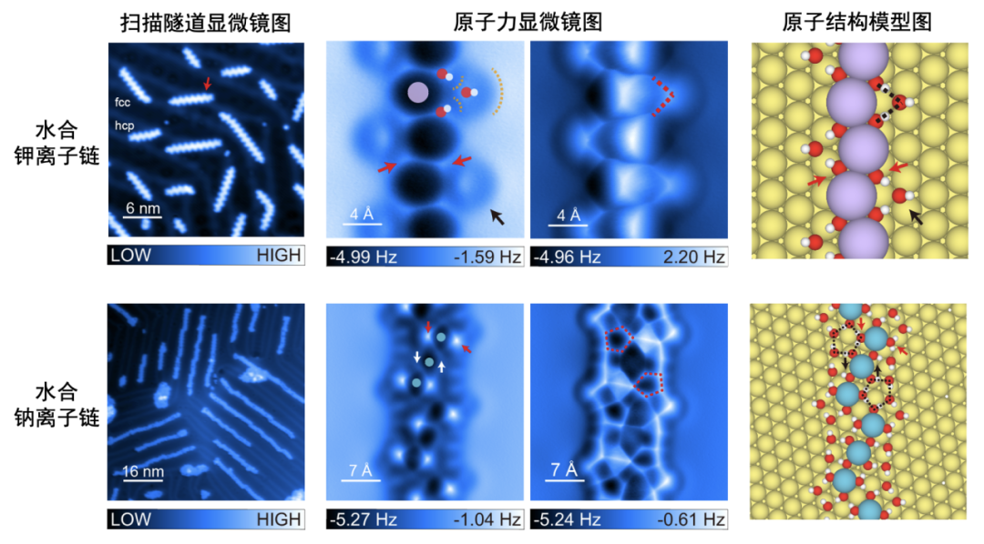 图1 Au(111)表面上钾离子、钠离子与水分子自组装形成的一维网络STM实验图(第一列),高分辨AFM实验图(第二列,第三列)以及原子结构模型图(第四列)。