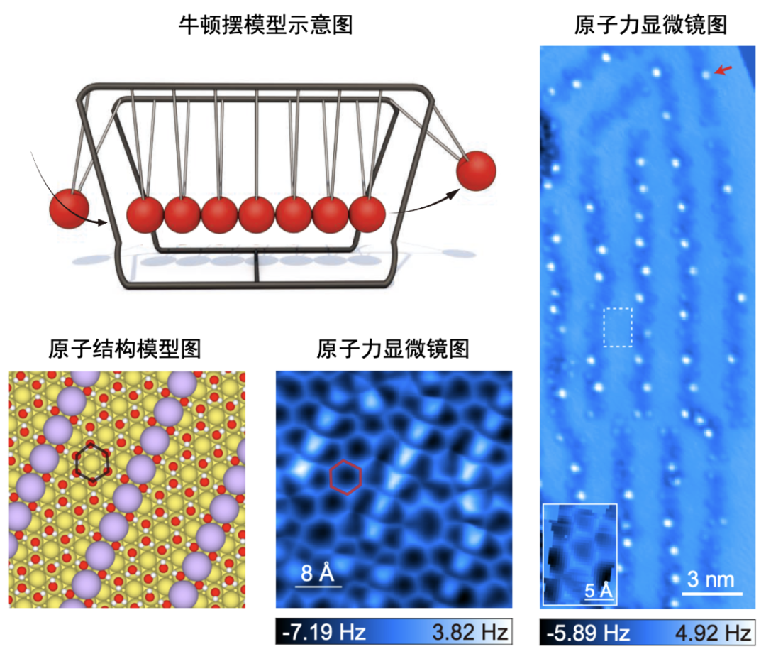 图2 牛顿摆模型示意图与水合钾离子向列相高分辨AFM图与原子结构模型图。