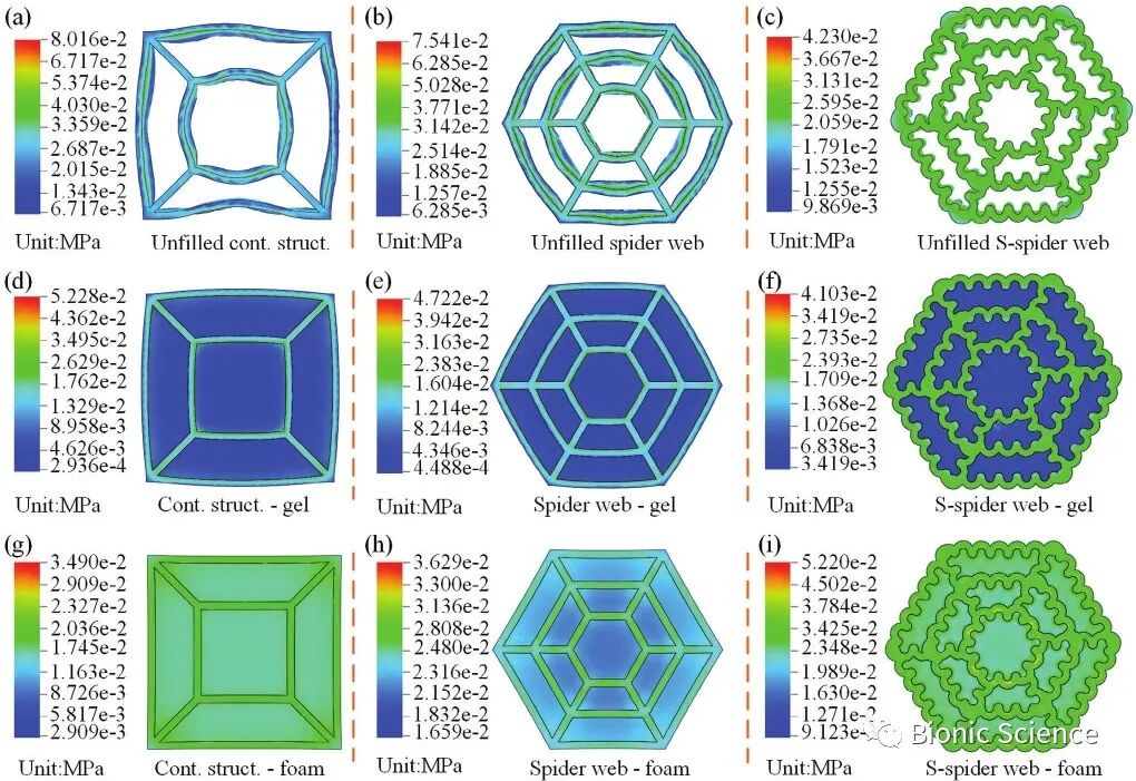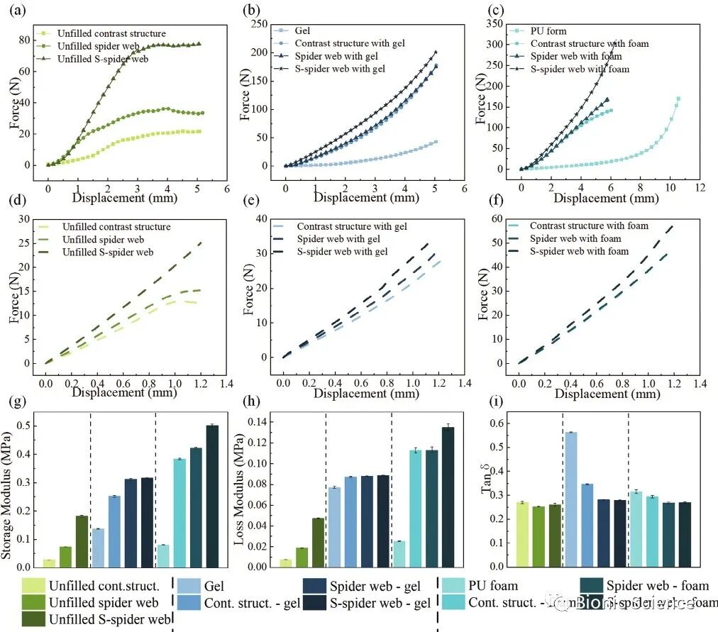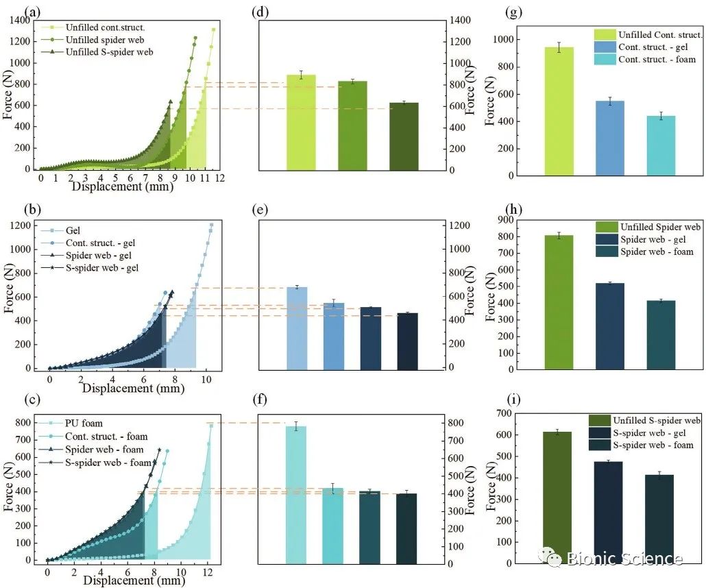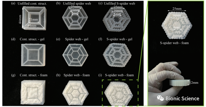 为了将集成仿生结构进行比较,研究采用了对比实验。对比结构要么没有蜘蛛网结构,要么没有模仿墨鱼骨头的s形边缘。有三种情况用于填充腹膜腔: 1.PU泡沫;2.Ecoflex凝胶(一种柔软和良好的缓冲,3.没有填充。因此,制备了9种不同结构的复合材料,均具有相同的体积。