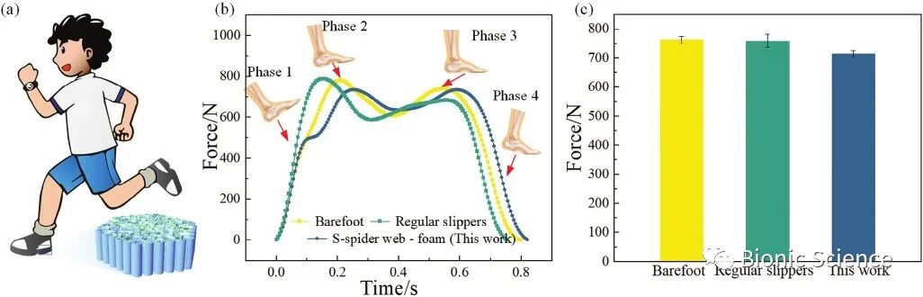 研究为了展示集成仿生材料在人体足部保护领域的潜在应用,我们将集成仿生材料嵌入到拖鞋的鞋跟中,并进行了行走测试。结果表明在正常速度下行走时与赤脚行走和穿着常规鞋垫相比,穿着仿生鞋垫时的冲击力最小。研究为了评估综合仿生材料保护易碎品的性能进行了鸡蛋掉落试验。当鸡蛋落在s型蜘蛛网泡沫上时,鸡蛋没有损坏,而当鸡蛋落在硅胶泡沫上时,鸡蛋破裂。