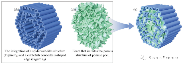 蛛网结构可以在空气中耗散高达70%的动态冲击能量;乌贼骨头的S型结构可以在深海中有效吸收能量。在植物世界中,柚子皮的多孔结构可以耗散高达98 J的冲击能量,并且具有出色的缓冲性能,可以有效地保护柚子果实。受墨鱼骨的S型结构、蜘蛛网结构和柚子皮的多孔材料的启发,研究将这三种结构材料整合到一个仿生设计中。