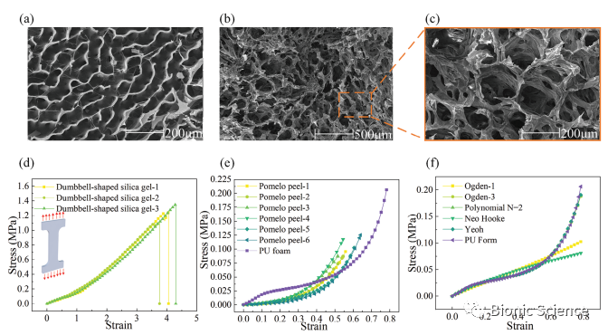 研究者对墨鱼骨的结构进行了表发现墨鱼骨具有弯曲的s形结构,如图3所示。研究将其作为本研究中的生物原型之一。根据之前的研究,蜘蛛网具有多边形的网状结构。研究考虑了正六边形的网结构,并将其作为本研究的第二种仿生结构。柚子皮通过扫描电子显微进行观发现了之前研究发现的多孔结构。同时,研究在哑铃形状的试样中对其力学性能进行了表征。拉伸载荷下的应力-应变曲线显示出不显著的非线性。