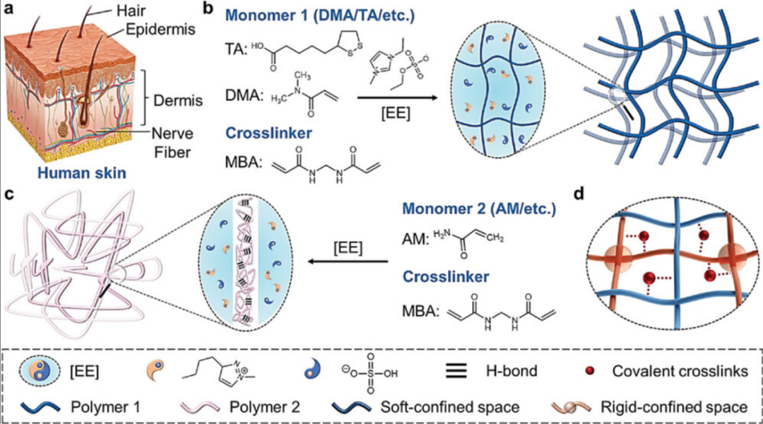 1. 图1展示了该二元空间限域策略制备仿生离子凝胶结构示意图。